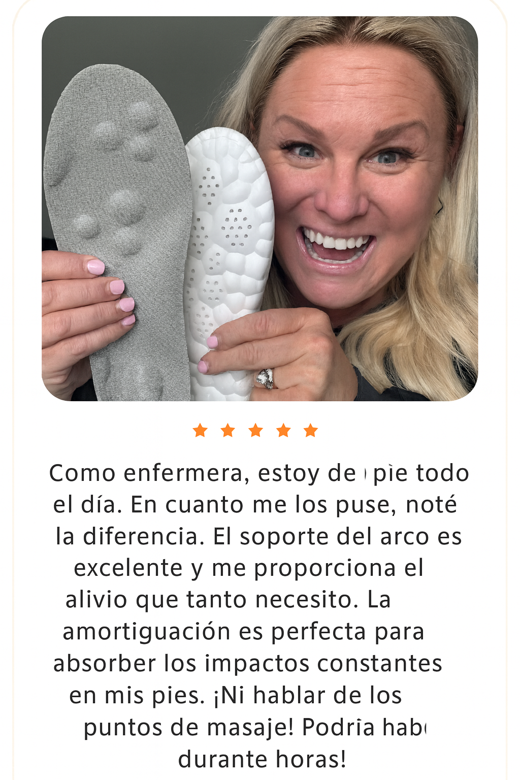 “Vita Step™ ofrece alivio, comodidad y soporte para diversas afecciones del pie, como fascitis plantar, dolor de arco, dolor de talón y metatarsalgia.”